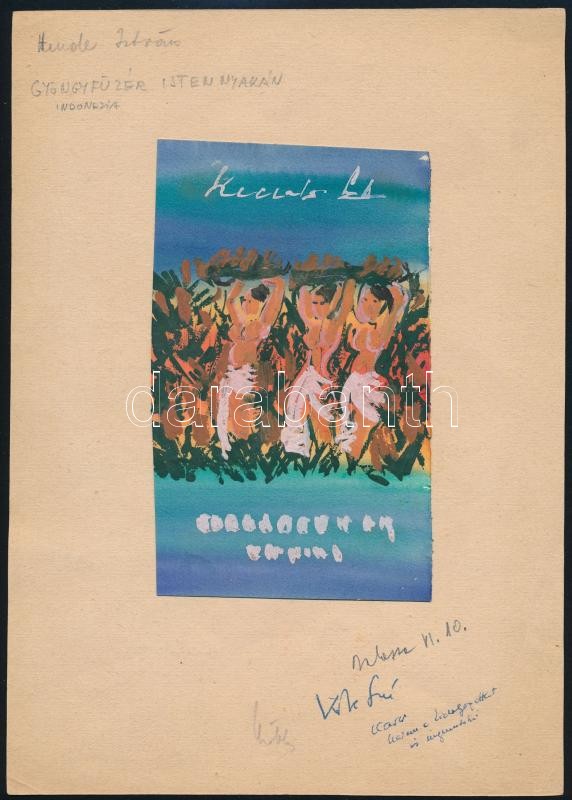Beschreibung: Olvashatatlan jelzéssel: Kende István Gyöngyfüzér Isten nyakán című könyvének borító terve, tempera, papír, papírra ragasztva 14x8,5 cm