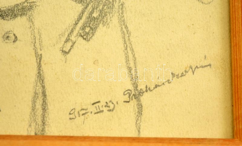 Beschreibung: Prohászka jelzéssel: Hegedülő katona. Ceruza, papír, üvegezett keretben, 19×15 cm