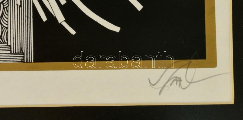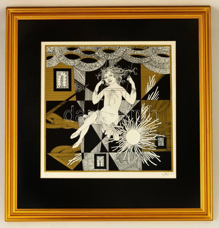 Beschreibung: Szász Endre (1926-2003): Hintázó lány. Szitanyomat 46/100, papír, jelzett, üvegezett keretben, 41×41 cm