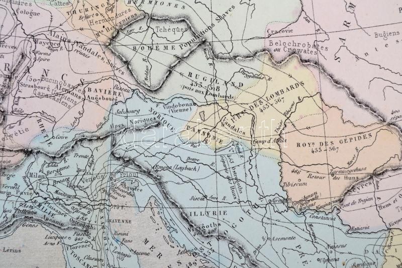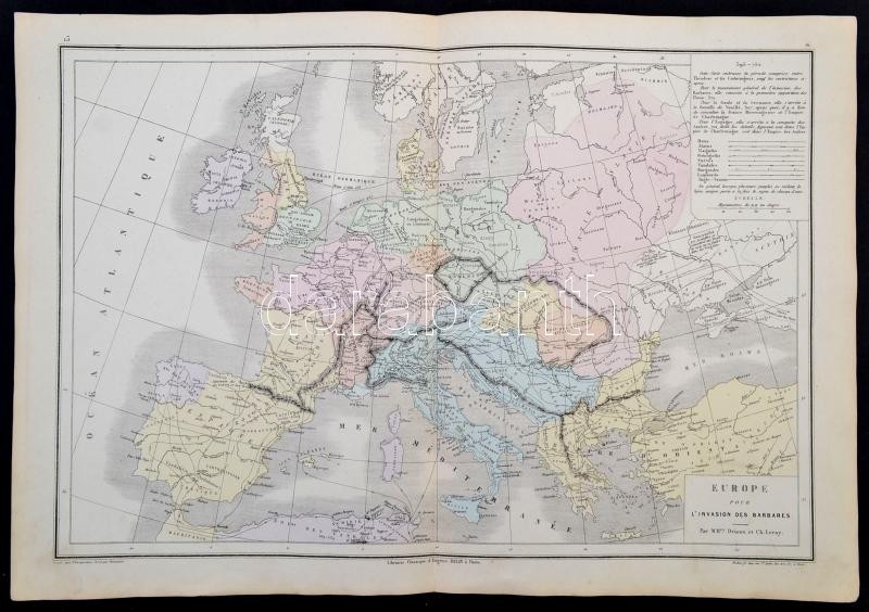 cca 1880 Európa és a barbár inváziók. Europe pour L'Invasion des Barbares, Paris, Librarie Classique d'Eugéne Belin, színezett rézmetszet, francia nyelven, 29x42 cm.