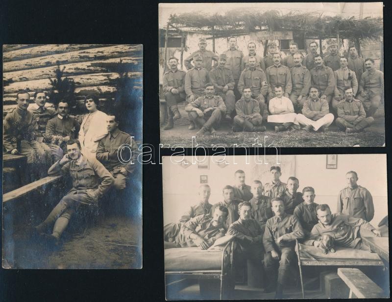 Beschreibung: 1918 3 db humoros katonai fotó a Pjescsankai hadifogoly táborban, magyar hadifoglyok Caffe zum nackten Elend- Kávézó a puszta éhséghez címmel. 9x14 cm