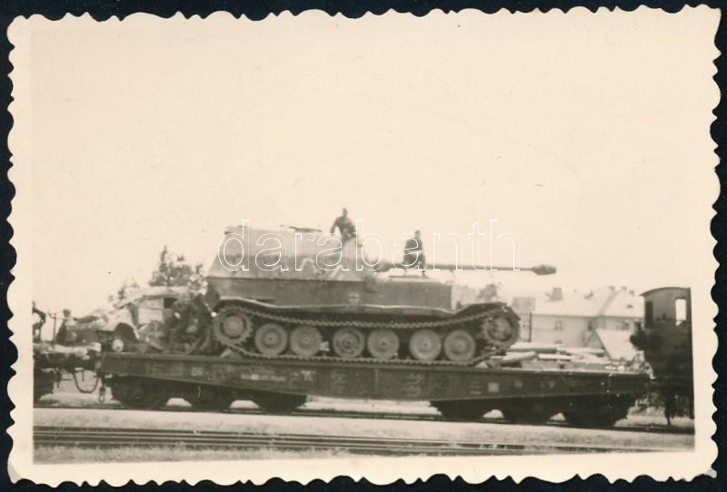 Beschreibung: cca 1942 Német Ferdinánd páncélvadász harckocsi szállítása MÁV vonaton, 6x9 cm