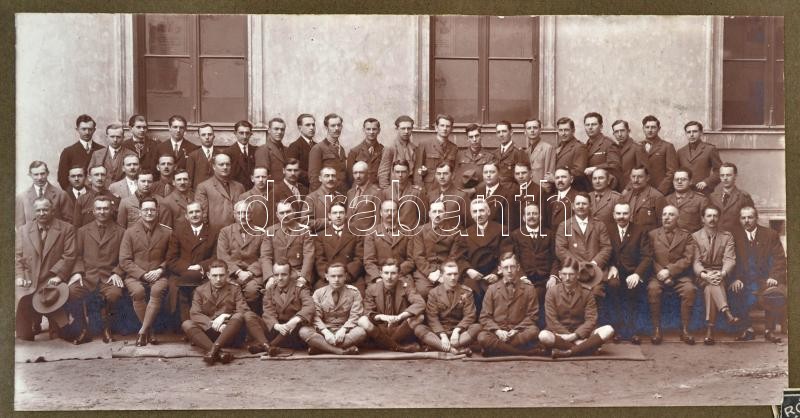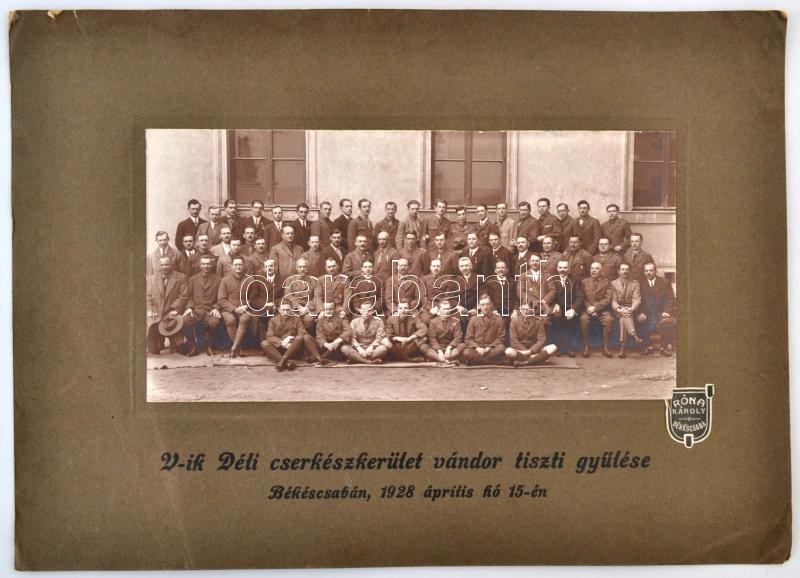 Beschreibung: 1928 5. déli cserkészkerület vándor tiszti gyűlése, csoportkép, Róna Károly békéscsabai műterméből, kartonra ragasztva, feliratozva, 24×34 cm