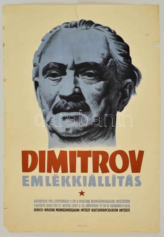 1952 Gábor Pál (1913-1993): Dimitrov emlékkiállítás a Munkásmozgalmi I... https://www.darabanth.com/de/308-Fernauktion/308.0/Andere-Sammelgebiete/Poster~28/1952-Gabor-Pal-1913-1993-Dimitrov-emlekkiallitas-a-Munkasmozgalmi-Intezetben-plakat-sz~II1673874