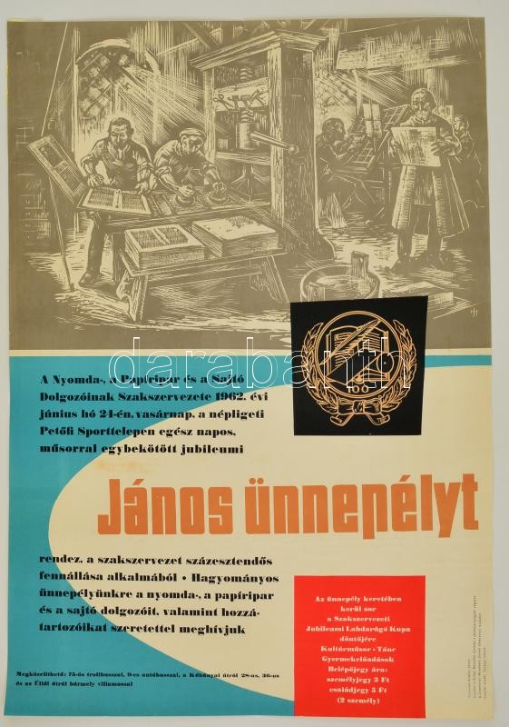 1962 Erdélyi János (1913-1983): János ünnepély a Nyomda- Papíripar és a Sajtó dolgozóinak szakszervezete rendezésében, a népligeti Petőfi Sporttelepen, plakát, 82x57,5 cm