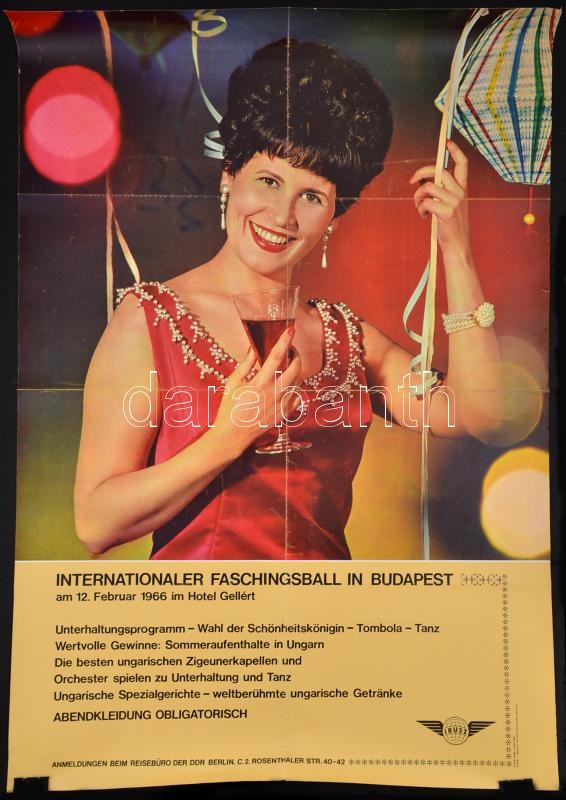 1966 Internationaler Faschingsball im Budapest / Nemzetközi farsangi bál Budapesten a Gellért hotelben, német nyelvű Ibusz reklámplakát, hajtásnál kis szakadások, 97x66 cm