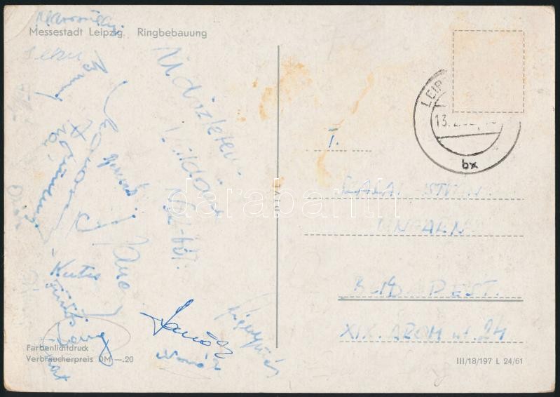 Beschreibung: cca 1962 A Dorog játékosainak (Buzánszky, Monostori, Marosvölgyi, stb.) aláírásai levelezőlapon