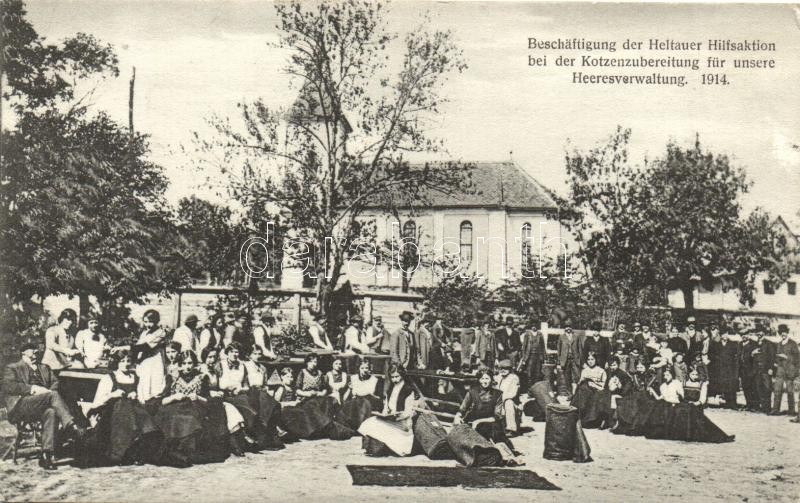 1914 Nagydisznód, Heltau, Cisnadie; A nagydisznódi segélyszervezet foglalkoztatása a hadsereg előkészítésére. Jos. Briegel felvétele, Jos. Drotleff kiadása / Beschäftigung der Heltauer Hilfsaktion bei der Kotzenzubereitung für unsere Heeresverwaltung / WWI employment of the Heltau relief organization during the preparation of the army (EK)