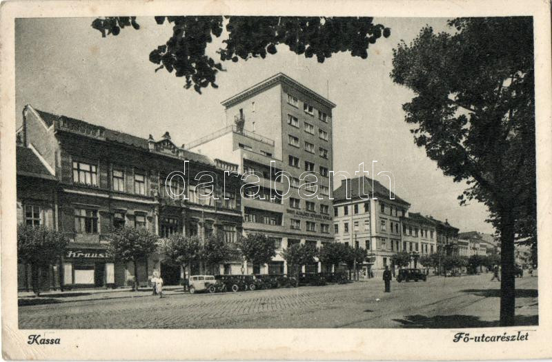 Kassa, Kosice; Fő utca, üzletek, automobilok / main street, automobile... https://www.darabanth.com/de/308-Fernauktion/308.0/Ansichtskarten/Slowakei~400009/Kassa-Kosice-Fo-utca-uzletek-automobilok-main-street-automobiles-shops-EK~II866365