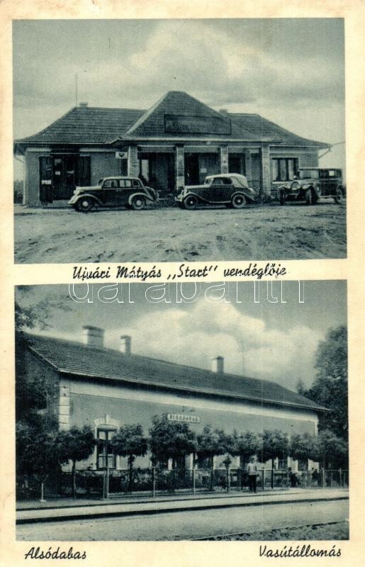 Beschreibung: Alsódabas, Újvári Mátyás Start vendéglője automobilokkal, vasútállomás