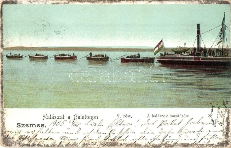 Balaton, Halászat V. rész; A halászok hazatérése https://www.darabanth.com/de/308-Fernauktion/308.0/Ansichtskarten/Ungarn~400007/Balaton-Halaszat-V-resz-A-halaszok-hazaterese~II1601978