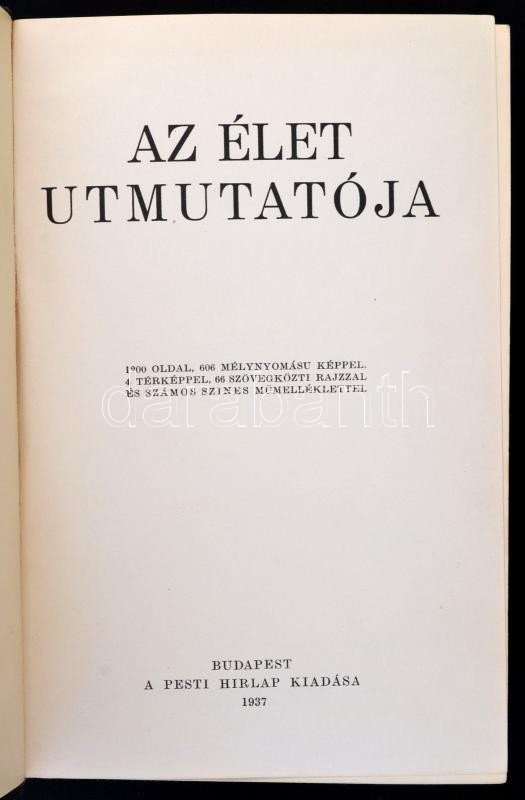 A Pesti Hírlap Könyvtára: Az élet útmutatója. 1200 oldal, 606 mélynyomású képpel, 4 térképpel, 66 szövegközti rajzzal és számos színes műmelléklettel. Bp., 1937, Pesti Hírlap. Kiadói, kopottas gerincű egészvászon-kötésben, ex libris-szel, belül alapvetően jó állapotban.