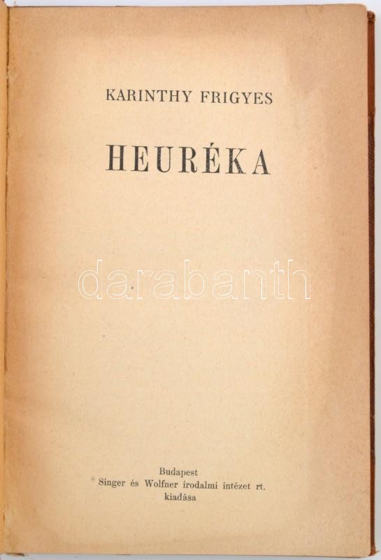 Karinthy Frigyes: Heuréka. Budapest, 1927, Singer és Wolfner Irodalmi Intézet Rt.,186 p. Átkötött egészvászon kötés, kissé foltos borítóval, kissé vetemedett kötéssel. Első kiadás.