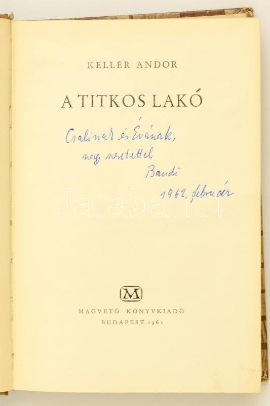 Kellér Andor: A titkos lakó. Bp., 1962, Magvető. Kiadói félvászon-köté... https://www.darabanth.com/de/308-Fernauktion/308.0/Bucher/Bucher-Andere-kuriositaten~500018/Keller-Andor-A-titkos-lako-Bp-1962-Magveto-Kiadoi-felvaszon-kotes-A-szerzo-altal-de~II1670814