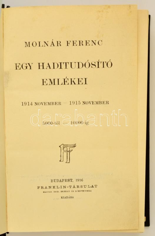 Molnár Ferenc: Egy haditudosító emlékei. 1914 november - 1915 november... https://www.darabanth.com/de/308-Fernauktion/308.0/Bucher/Bucher-Militaria~500006/Molnar-Ferenc-Egy-haditudosito-emlekei-1914-november--1915-november-Bp-1916-Franklin-Tar~II1675486