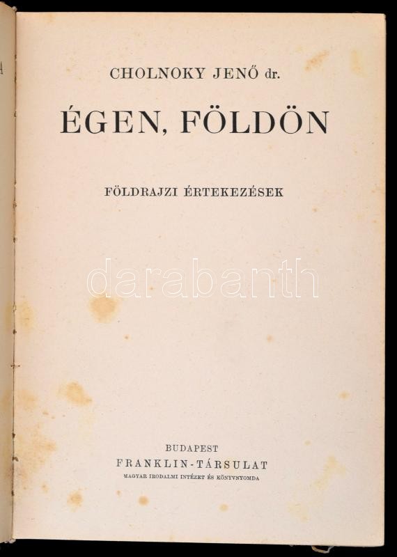 Cholnoky Jenő: Égen, földön. Földrajzi értekezések. Magyar Földrajzi Társaság Könyvtára. Bp., é. n., Franklin-Társulat. Kiadói aranyozott egészvászon sorozatkötésben, kopottas borítóval, de belül jó állapotban.