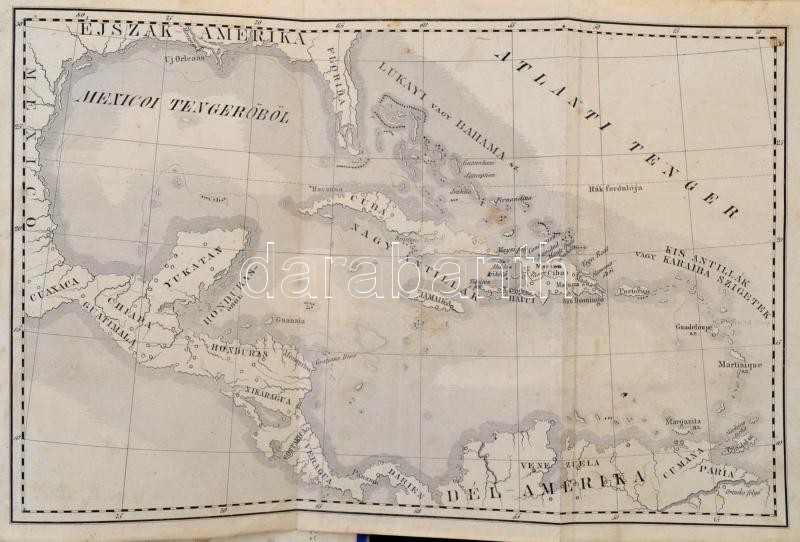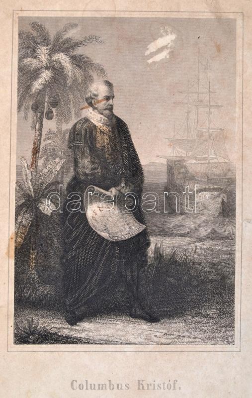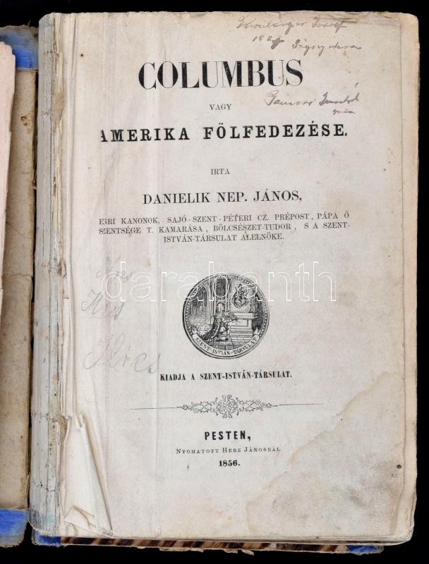Danielik Nep[omuk] János: Columbus vagy Amerika fölfedezése. Első kiadás. Pesten, 1856. Herz János 2 t. (címképmetszet: Colombus Kristóf portréja,+ VI + [2] + 406 p. + 1 kihajtható térkép. Korabeli erősen megviselt félvászon kötésben, Címkép szakadozott, könyvtest elvált.
