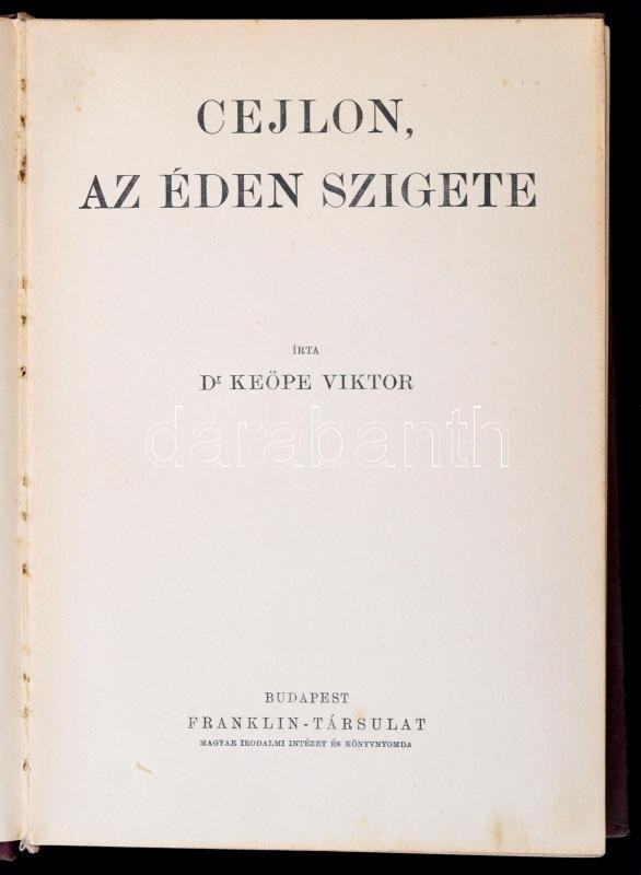Keöpe Viktor: Cejlon, az éden szigete. Magyar Földrajzi Társaság Könyvtára. Bp., é. n., Franklin-Társulat. Kiadói aranyozott egészvászon sozozatkötésben, kopottas borítóval, de belül jó állapotban.