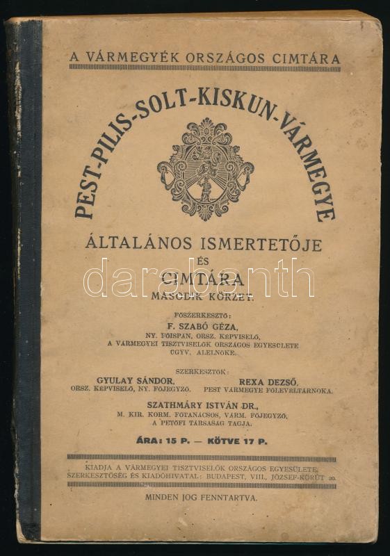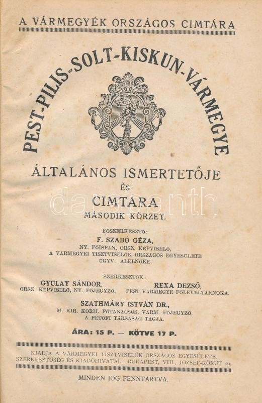 Pest-Pilis-Solt-Kiskun-Vármegye általános ismertetője és címtára. Második körzet. Szerk.: F. Szabó Géza, Gyulay Sándor, Rexa Dezső, Dr. Szathmáry István. Vármegyék Országos Címtára. Bp., 1930, Vármegyei Tisztviselők Országos Egyesülete. Kiadói félvászon-kötés, sérült gerinccel.