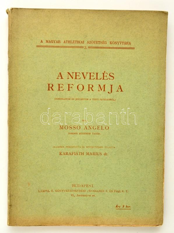 Mosso Angelo: A nevelés reformja. (Gondolatok és jegyzetek a testi nevelésről.) Fordította: Dr. Karafiáth Marius. A Magyar Athletikai Szövetség Könyvtára 3. Bp., 1911, Lampel R. (Wodianer F. és Fiai) Rt,VIII+151 p. Kiadói papírkötés, felvágatlan példány, jó állapotban. Szilágyi Géza (1912-2002) kosárlabdázó, testnevelő tanár, olimpikon (1936, Berlin), Országos Kosárlabda Szövetség elnöke, szakreferens névbejegyzésével.
