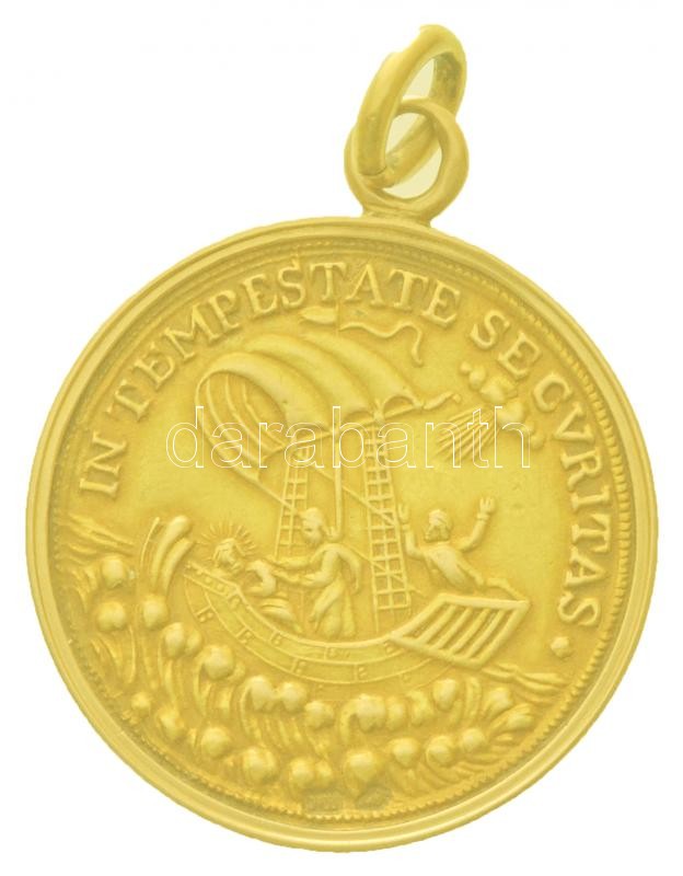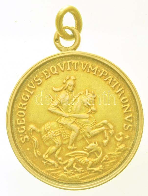 ~1900. "Szent György" jelzett Au emlékérem, jelzett Au keretben, "S:GEORGIUS EQVITVM PATRONVS / IN TEMPESTATE SECVRITAS" (br. 5,26g/0.580/26mm kerettel együtt) T:2 / ~1900. "Saint George" hallmarked Au commemorative medallion in hallmarked Au frame "S:GEORGIUS EQVITVM PATRONVS / IN TEMPESTATE SECVRITAS" (br. 5,26g/0.580/26mm with frame) C:XF