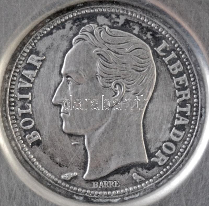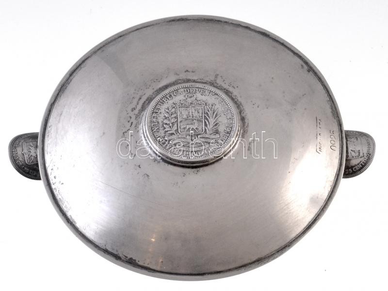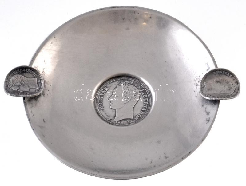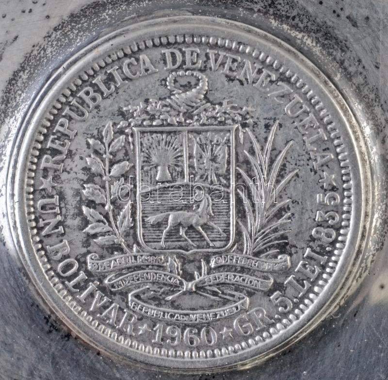 Venezuela 1954. 25c Ag + 1960. 25c Ag + 1B Ag mindhárom érme jelzett (0.925) ezüst hamutálcához rögzítve (br. 29,38g) Venezuela 1954. 25 Centimos Ag + 1960. 25 Centimos Ag + 1 Bolivar Ag all three coins on a silver hallmarked (0.925) ashtray (br. 29,38g)