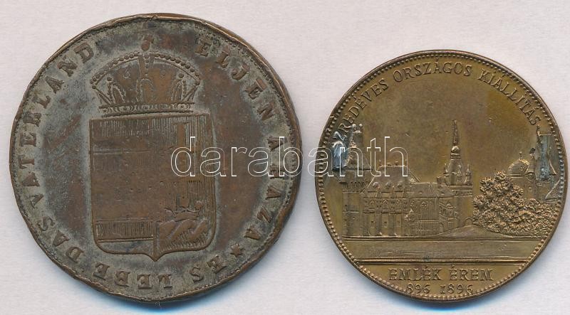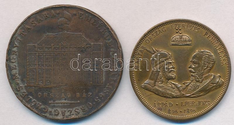 1867. "Emlékül az 1865. évi Országgyűlés megnyitására / Éljen a Haza - Es Lebe Das Vaterland" Br emlékérem (39mm) + 1896. "Magyarország Ezeréves Fennállása - Árpád - I. Ferenc József 896-1896 / Ezredéves Országos Kiállítás - Emlékérem 896-1896" Br emlékérem (33mm) T:2-,3 ph, forrasztásnyom