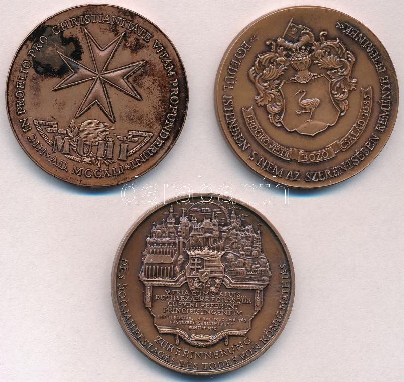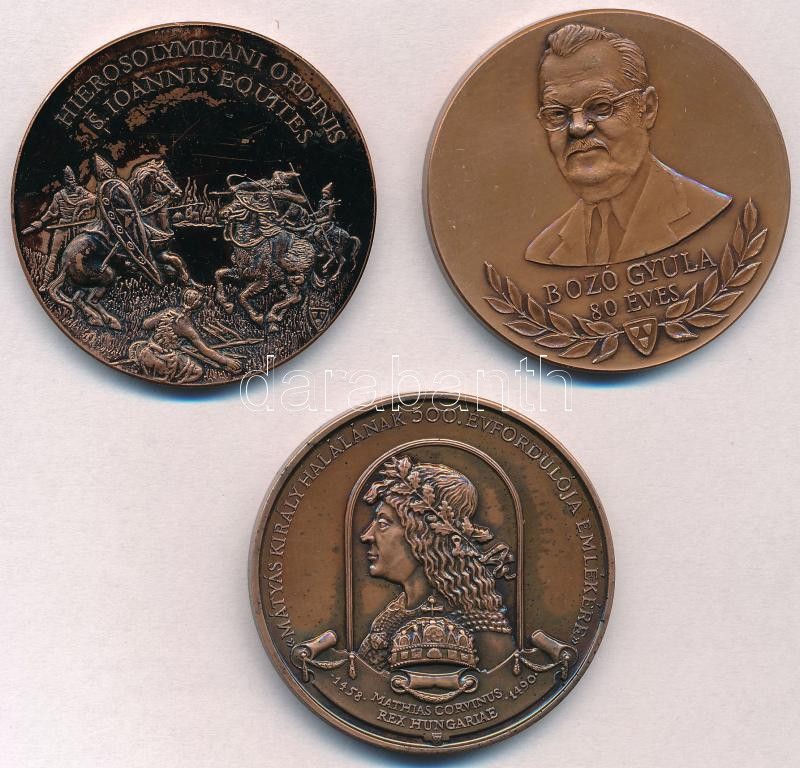Beschreibung: Bozó Gyula (1913-2004) 1990. "Mátyás király halálának 500. évfordulója emlékére" Br emlékérem (42,5mm) + 1993. "Bozó Gyula 80 éves" Br emlékérem (42,5mm) + Bozó Gyula (1913-2004) / Szabó Géza (1939-) DN "Johannita rend / 1241. Muhi" Br emlékérem (42,5mm) T:1--2- patina