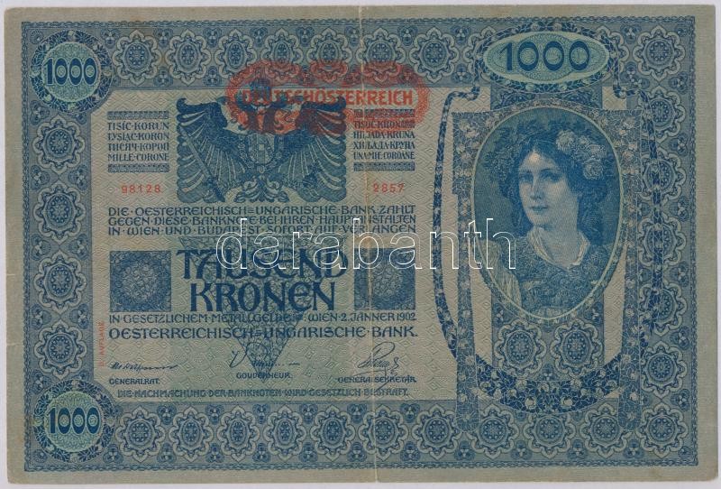 Ausztria 1919. (1902) 1000K, vízszintes "DEUTSCHÖSTERREICH" felülbélyegzéssel, mindkét oldal német T:III