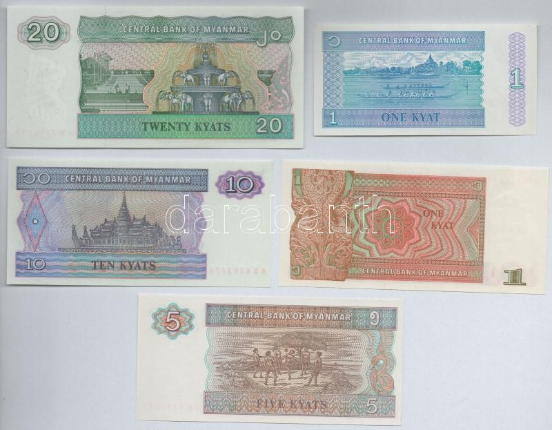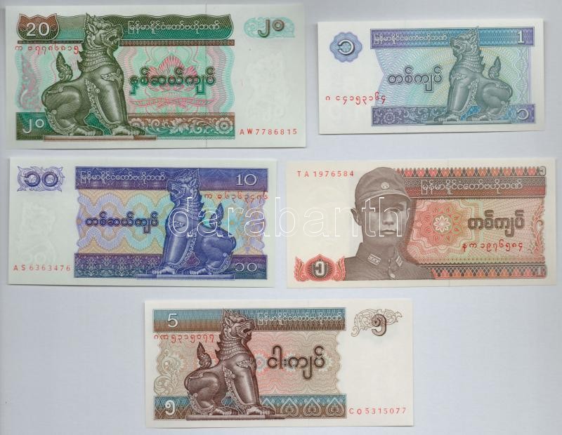 Myanmar 1990. 1 Kyat + 1996. 1 Kyat + 1997. 5 Kyats + 10 Kyats + 1994. 20 Kyats C:UNC,AU