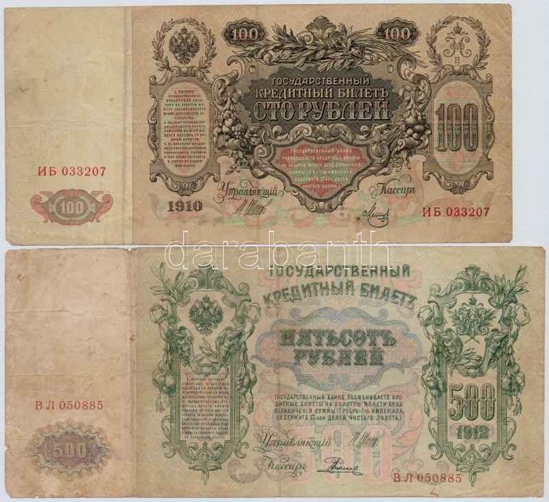 Russ... https://www.darabanth.com/de/308-Fernauktion/308.0/Numismatik/Weltweit-Banknoten~300012/Orosz-Birodalom-1912-1917-100R-plus-500R-Szign-Shipov-TIII-III---Russian-Empire-1912-1917-100-Rubl~II1677625