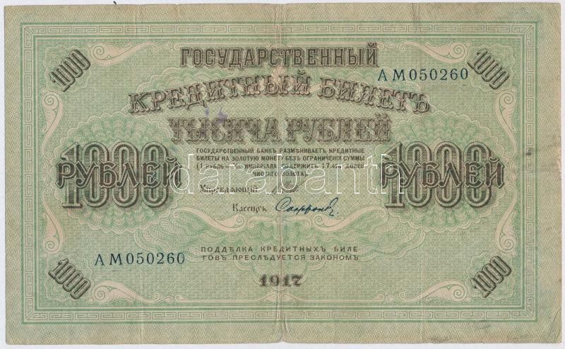 Russian Empire 1917. 1000 Rubl... https://www.darabanth.com/de/308-Fernauktion/308.0/Numismatik/Weltweit-Banknoten~300012/Orosz-Birodalom-1917-1000R-TIII-ly--Russian-Empire-1917-1000-Rubles-CVG-hole--Krause-37~II1675365