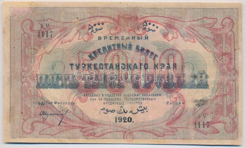 Orosz Polgárháború / Orosz Közép Ázsia / Turkesztán 1920. 5000R T:III-,IV restaurált