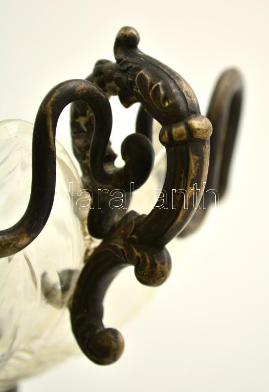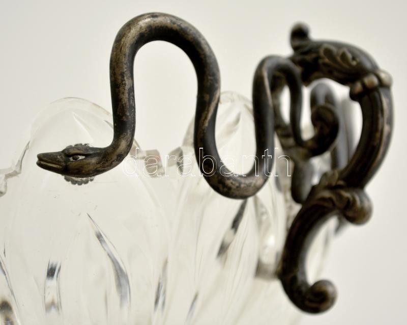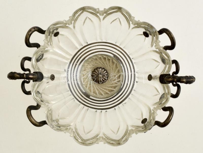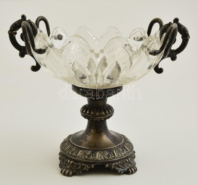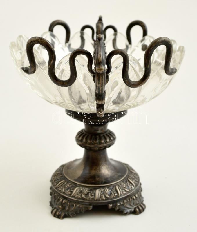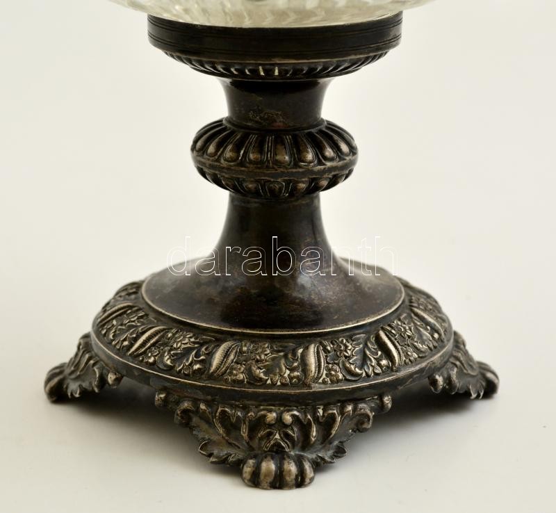 Beschreibung: Ezüst (Ag.) talpas kínáló, üveg betéttel, jelzett, apró csorbákkal, kis hiánnyal, m:18,5 cm