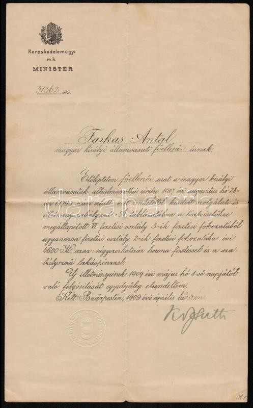 1909 Bp., Kossuth Ferenc (1841-1914) kereskedelemügyi miniszter aláírá... https://www.darabanth.com/de/309-Fernauktion/309.0/Andere-Sammelgebiete/Dokument~16/1909-Bp-Kossuth-Ferenc-1841-1914-kereskedelemugyi-miniszter-alairasa-kinevezo-okmanyon~II1685894
