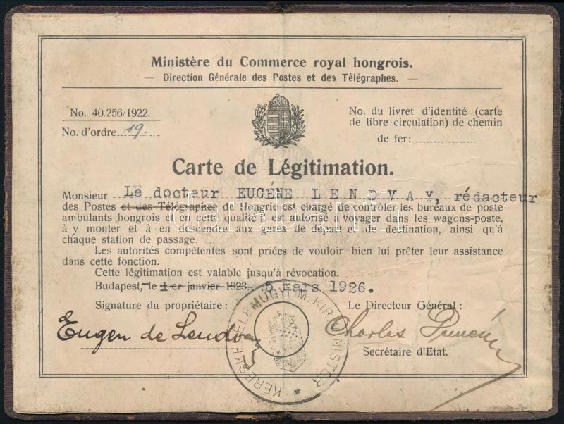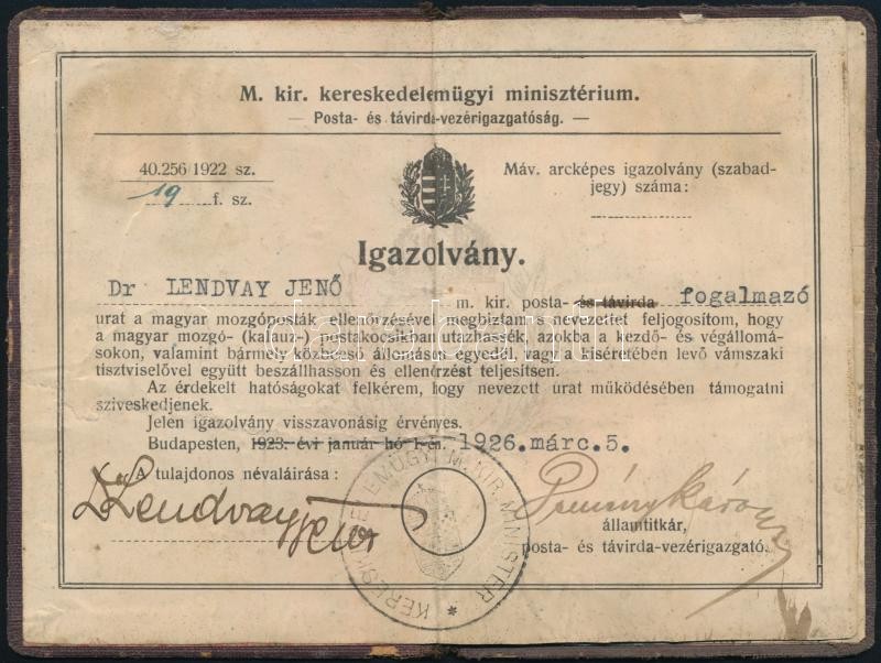 1926 M. Kir. Kereskedelemügyi Minisztérium - Posta- és távírda- vezérigazgatóság - postakocsiban való utazásra, valamint ellenőrzésre jogosító igazolványa, magyar és francia nyelven, pecséttel, viseltes vászonkötésben.