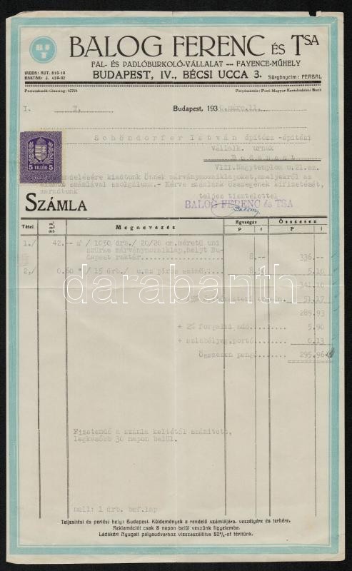 Beschreibung: 1930 Balog Ferenc és Tsa Fal- és Padlóburkoló Vállalat, díszes fejléces számla, okmánybélyeggel, 33,5x20,5 cm