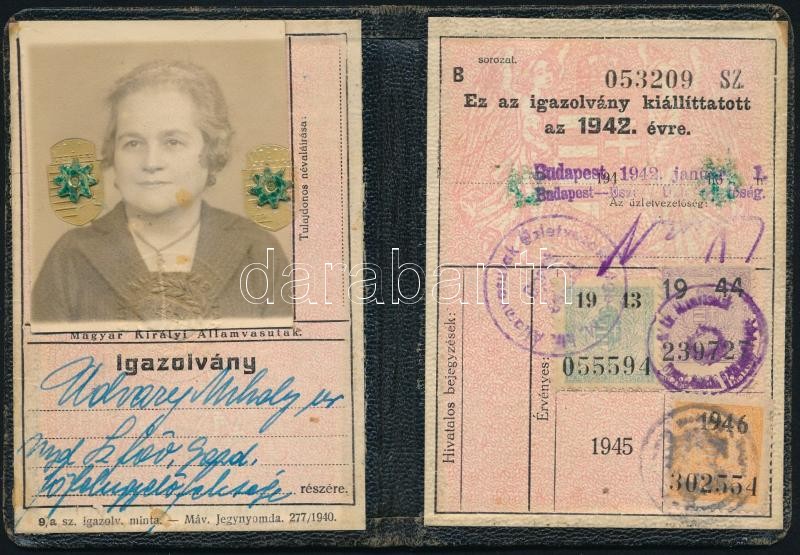 1942-1946 Magyar Királyi Államvasutak féláru-jegy váltására jogosító a... https://www.darabanth.com/de/309-Fernauktion/309.0/Andere-Sammelgebiete/Dokument~16/1942-1946-Magyar-Kiralyi-Allamvasutak-felaru-jegy-valtasara-jogosito-arckepes-igazolvany-~II1543981