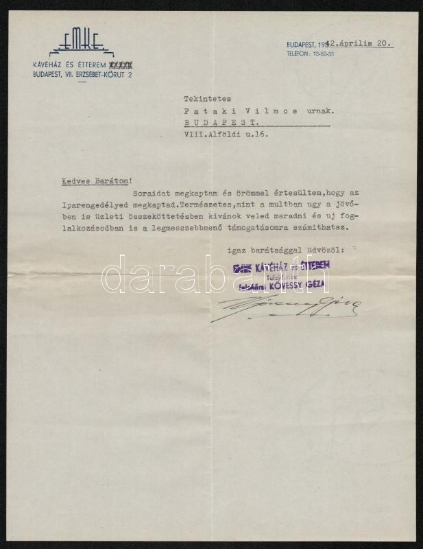 1942 EMKE Kávéház és Étterem, díszes fejléces levél, a tulajdonos Köve... https://www.darabanth.com/de/309-Fernauktion/309.0/Andere-Sammelgebiete/Dokument~16/1942-EMKE-Kavehaz-es-Etterem-diszes-fejleces-level-a-tulajdonos-Kovessy-Geza-alairasC3~II1683311