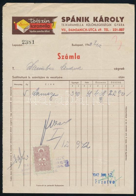 Beschreibung: 1942 Spánik Károly Tejkaramella Különlegességek Gyára, díszes fejléces számla, okmánybélyeggel, 24x17 cm