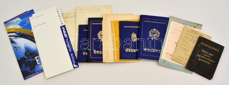 Beschreibung: cca 1934-1991 Vegyes okmány tétel (MÁV igazolvány, igazolvány társadalombiztosítási szolgáltatásokról, útlevél, MALÉV jegy, stb.)