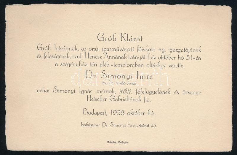 1928 Két nyomtatvány: Budapesten működő Magyar-francia elemi fiúiskola bizonyítványa Simonyi Imre részére. + Gróh Klára hegedűművész és Dr. Simonyi Imre m. kir. rendőrorvos esküvői meghívója
