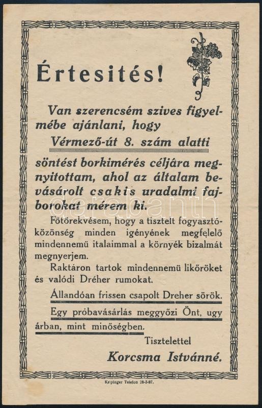 1934 Bp., Értesítő szórólap I. kerület Vérmező utcai borkimérés megnyi... https://www.darabanth.com/de/309-Fernauktion/309.0/Andere-Sammelgebiete/Drucksachen~26/1934-Bp-Ertesito-szorolap-I-kerulet-Vermezo-utcai-borkimeres-megnyitasarol-hajtott~II1686042