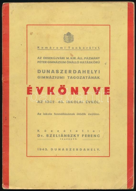 1943 Dunaszerdahely, Az Érsekújvári M. Kir. Áll. Pázmány Péter Gimnázium önálló hatáskörű dunaszerdahelyi gimnáziumi tagozatának évkönyve az 1942-43. iskolai évről, 68p