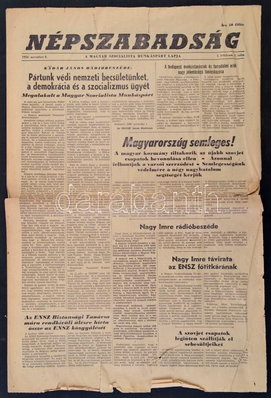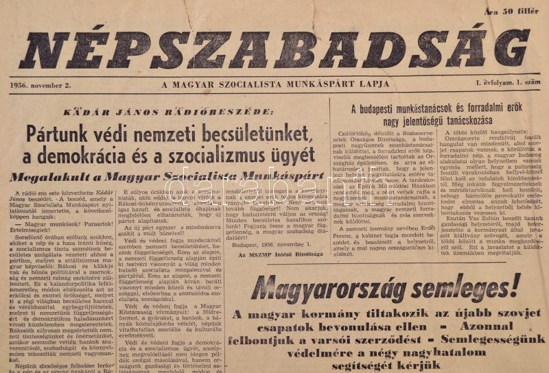 1956 a Népszabadság 1. évf. 1. lapszáma (nov. 2.) érdekes írásokkal https://www.darabanth.com/de/309-Fernauktion/309.0/Andere-Sammelgebiete/Drucksachen~26/1956-a-Nepszabadsag-1-evf-1-lapszama-nov-2-erdekes-irasokkal~II1683529