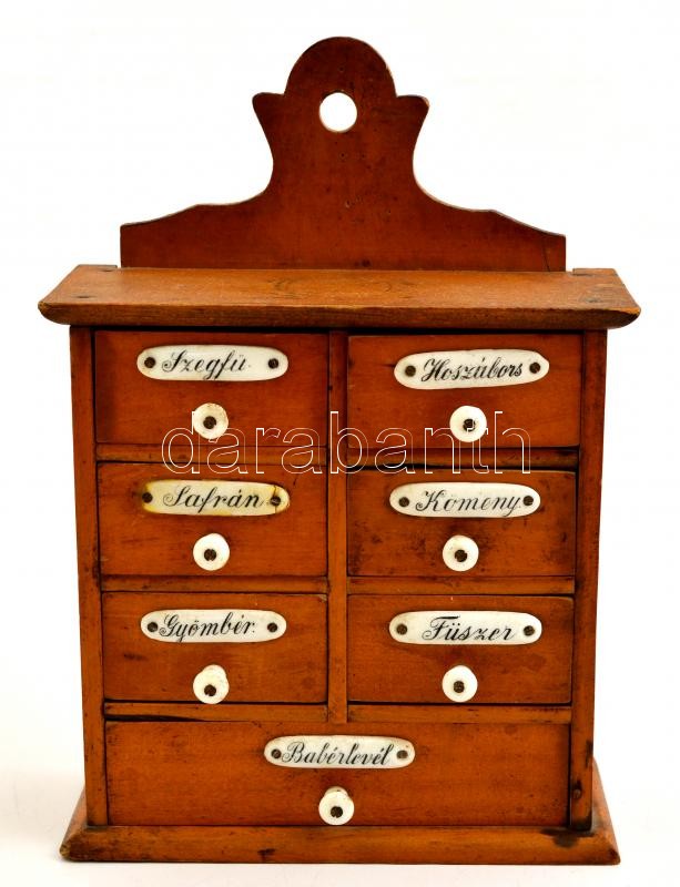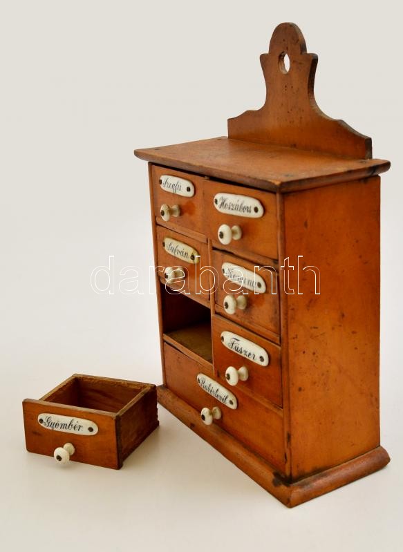 Porcelán rátétes fa konyhai fűszertartó szekrényke, 26×18×7,5 cm https://www.darabanth.com/de/309-Fernauktion/309.0/Andere-Sammelgebiete/Flohmarkt~11/Porcelan-ratetes-fa-konyhai-fuszertarto-szekrenyke-26C39718C3977-5-cm~II1682933