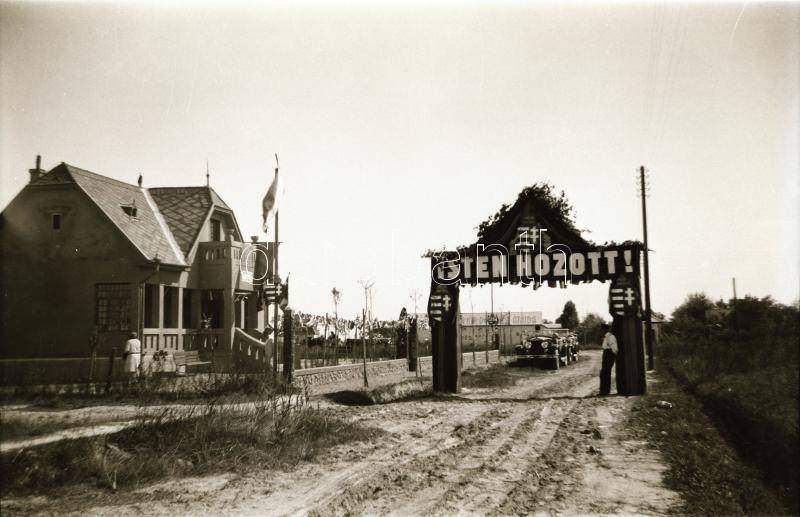 Beschreibung: cca 1938-1940 "Isten hozott!" - az elcsatolt részek visszatérésének alkalmából való bevonulásra készített díszkapu, fotónegatív, 6x9 cm