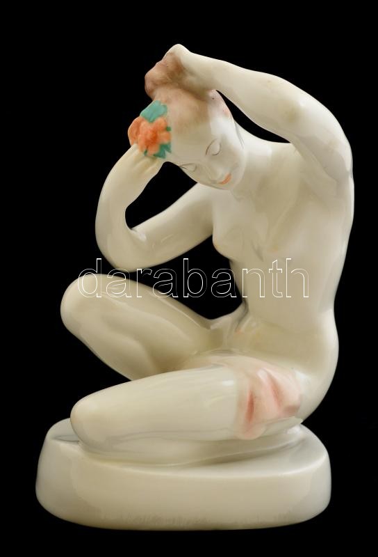 Beschreibung: Aquincumi porcelán fésülködő akt, kézzel festett, jelzett, hibátlan, m: 14 cm
