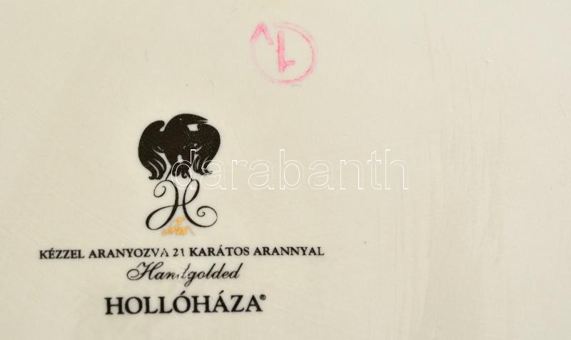 Hollóházi Szász Endre által tervezett fali tál, jelzett, matricás, kéz... https://www.darabanth.com/de/309-Fernauktion/309.0/Andere-Sammelgebiete/Porzellan~7/Hollohazi-Szasz-Endre-altal-tervezett-fali-tal-jelzett-matricas-kezzel-aranyozott-d31-cm~II1681574