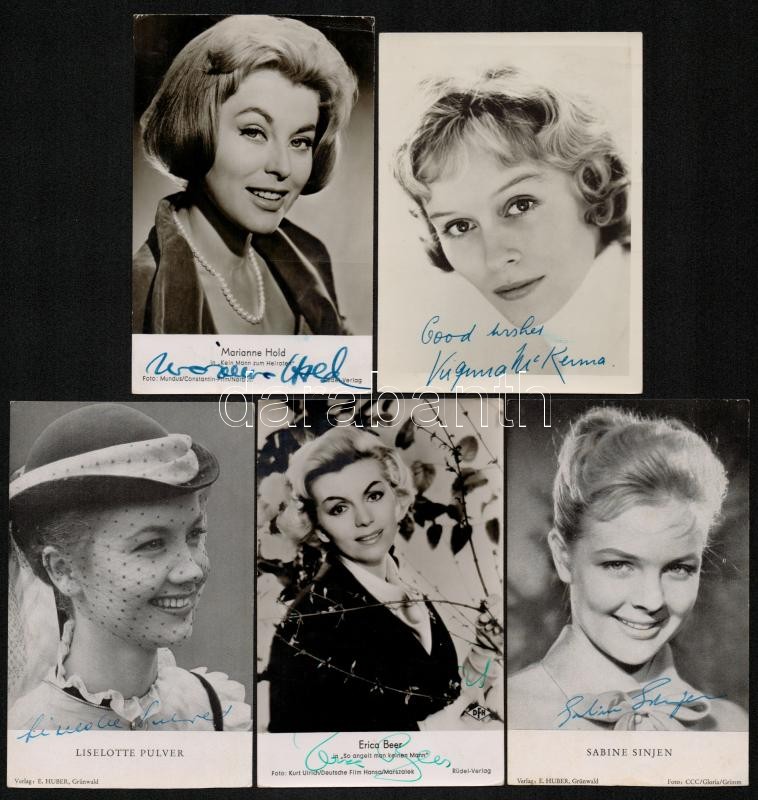 Külföldi színészek aláírt fotói, képeslapjai, 5 db, Erica Beer, Sabine Sinjen, Marianne Hold, Virginia McKenna, Liselotte Pulver, 14x9 cm és 9x13 cm közötti méretben.